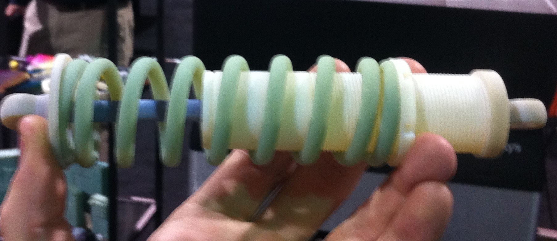 Polyjet 3D printing examples: A multi-material shock & coil over printed fully assembled. They had Material samples including flexible & solid in any color including clear.
