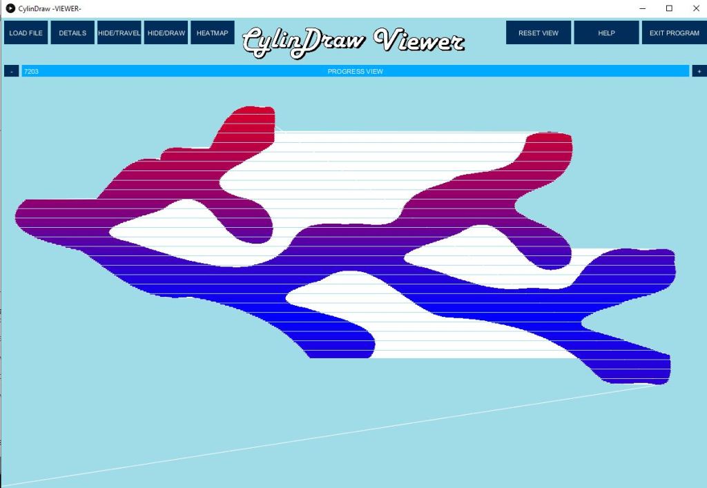 Here I’ve illustrated the tool path of a hatched circle and I set the line color to linearly change from red to blue as the drawing progresses for visualization purposes. It looks exactly how you would expect.