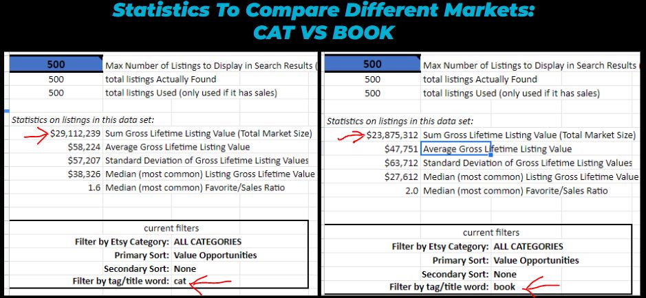 Then I compared ‘cat’ vs ‘book’ products and found cat to be the winning market. (All things being equal to you, appeal to cat people rather than book people on Etsy!)
