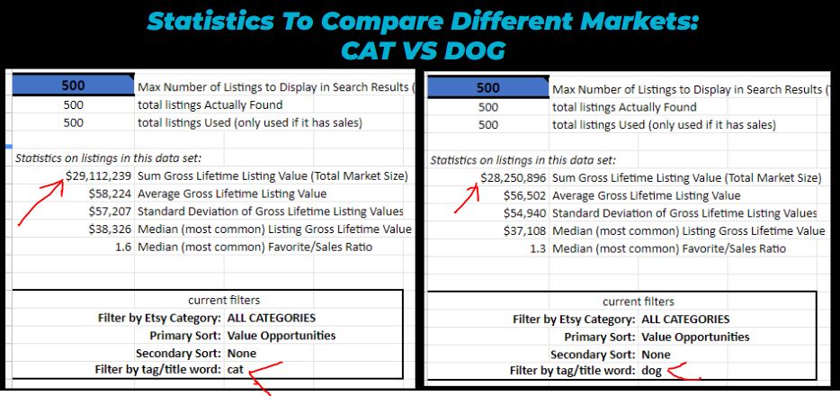 In this example I compare the market for ‘cat’ vs ‘dog’ products and found them to be roughly equal. What I expected!