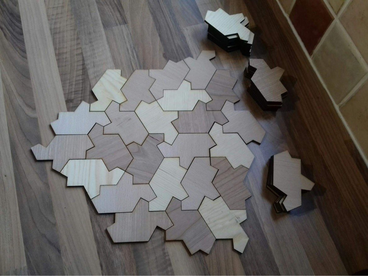 Speaking of repeating tiles, it’s a surprisingly rare thing to find patterns in nature that don’t contain a repeating sub-pattern. The oddly shaped ‘hat’ tile pictured on the right was just discovered in 2023. It self intersects & can be tiled any way you want forever and still never contain a ‘periodically’ repeating pattern, no matter what combination of pieces you select for the module!