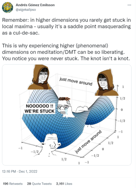 Imagine a robot using a literal compass pointing to the center of a labyrinth to navigate. If it’s search algorithm is simply ‘follow the compass’ then it ends up stuck on the nearest wall. A local optimum far from the desired result. You must deviate from the compass to make any further progress!