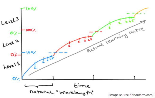 It’s a short book at 135 pages with basically 1 big idea that leaves me well convinced. As I read about the stepping stones I couldn’t help thinking of the chart I used in my slideshow intro: the ‘actual learning curve’. Which shows how a new strategy can fundamentally boost your skill to a new level, albeit with a diminishing return in a never ending process of seek, optimize, seek.