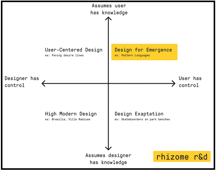 New design paradigm just dropped! (well, 1970-ish but new to me ) Kasey Klimes of rhizome R&D blog describes how design for emergence is a process where the designer assumes that the end-user’s knowledge is valuable enough to be worth granting them control over the design.